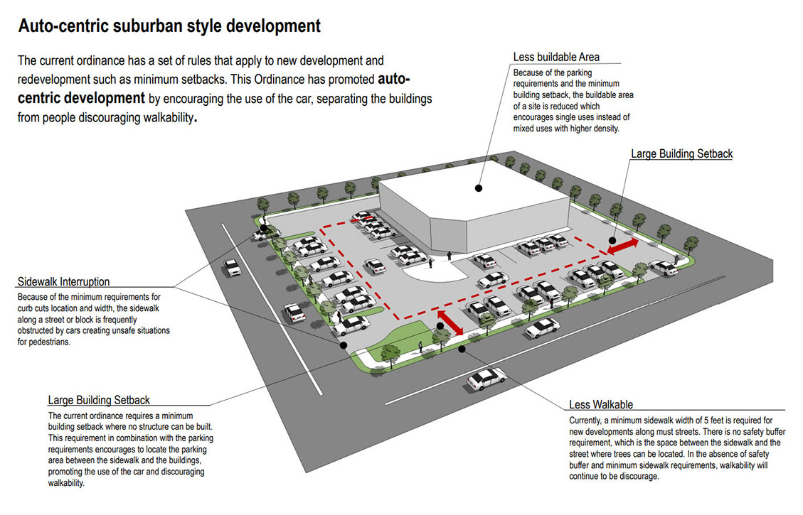 Auto-Centric Suburban Style Development Encouraged by Current Ordinances