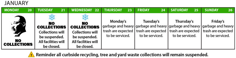 Tuesday's scheduled garbage routes and heavy trash is expected to be serviced. Reminder all curbside recycling, tree and yard waste collections will remain suspended.
